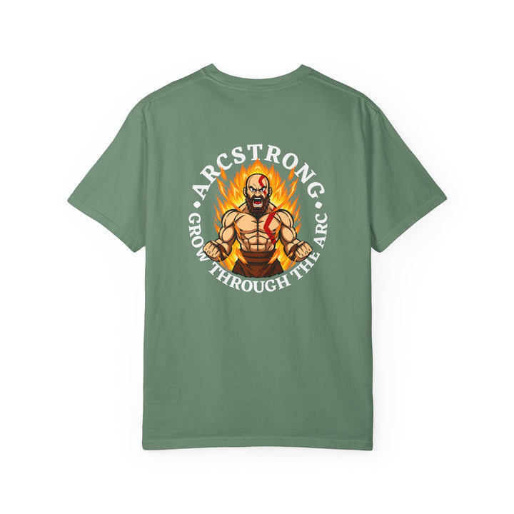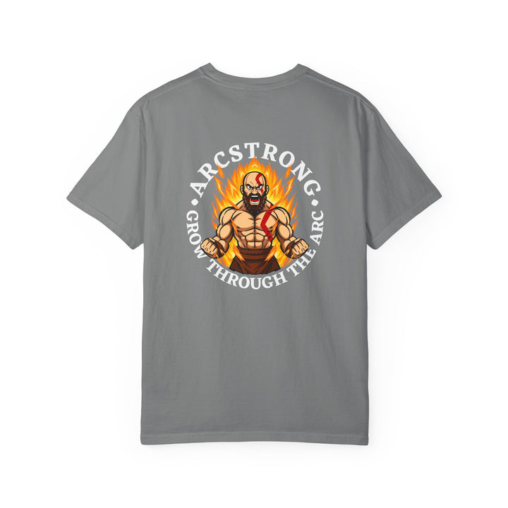 This unisex t-shirt features a bold back print of a warrior(we all know that's Kratos) engulfed in flames with the motivational mantra “Grow Through the Arc”, symbolizing strength, growth, and transformation. The front sports a clean Arcstrong logo for everyday versatility.